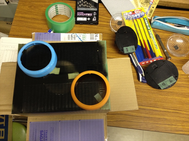 ダンボール箱を裏返してお手軽塗装台。パーツは目立たない内面から養生テープで固定。