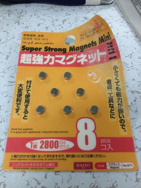 8個入り105円(当時)のネオジム磁石。こんなものがそこらの百均で簡単に手に入るのはありがたい限り。